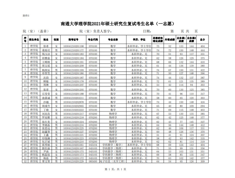 永利集团理学院2021年硕士研究生复试考生名单(一志愿)