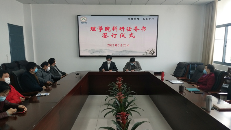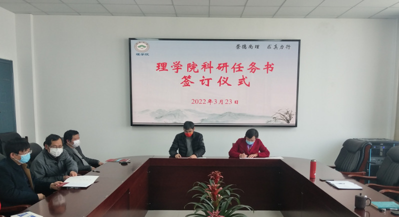 3月23日下午,理学院举行系科科研任务书签订仪式。学院党政负责人与5个系室的主任和支部书记共同签订了2022年度科研任务书。