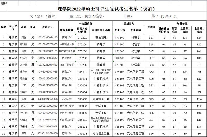 理学院2022年硕士研究生复试面试名单公示