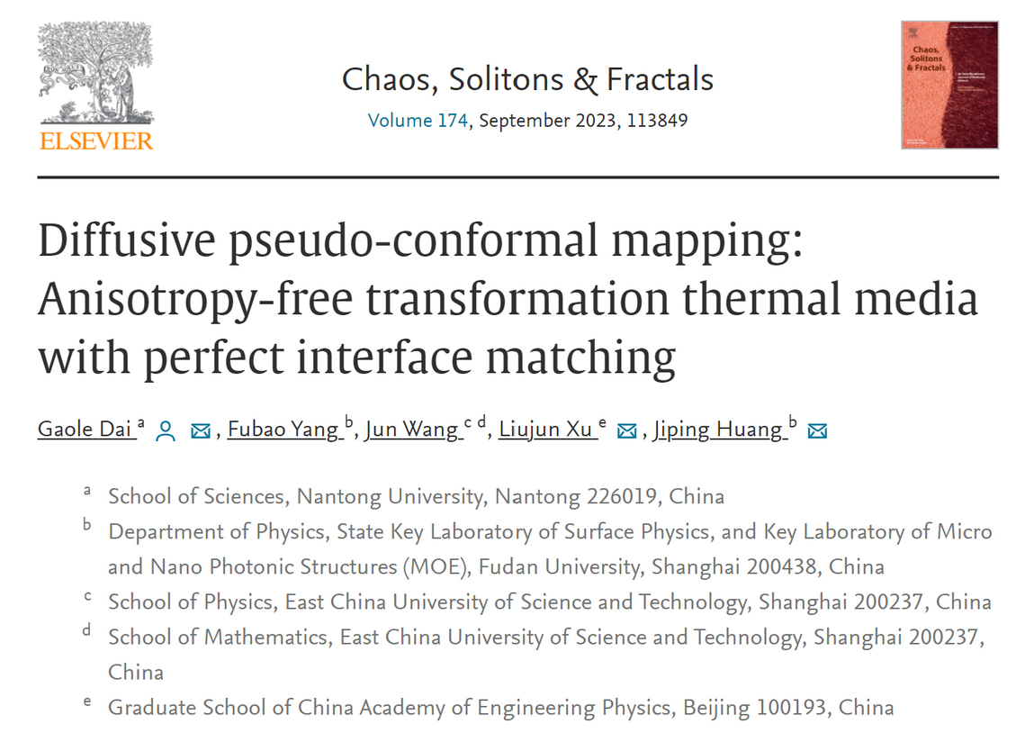 近日,理学院戴高乐博士与中国工程物理研究院须留钧博士、复旦大学物理学系黄吉平教授团队合作,在非线性科学领域的国际顶级学术期刊《混沌,孤子和分形》《(Chaos, Solitons & Fractals)》发表题为《扩散赝共形映射:具有完美界面匹配的无各向异性变换热介质》(《Diffusive pseudo-conformal mapping: Anisotropy-free transformation thermal media with perfect interface matching》)的研究论文。
