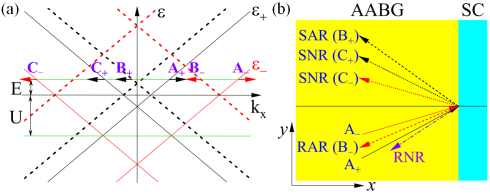 Andreev反射是一种发生在金属与超导界面的量子输运现象。金属端射向超导的电子会在界面处以空穴的形式发生反射,并在BCS超导中留下由两个自旋相反电子构成的库伯对。根据空穴的不同反射路径,Andreev反射可以分为原路Andreev反射和镜像Andreev反射。双层石墨烯具有AB堆垛、AA堆垛和转角三种结构,其中AA堆垛双层石墨烯(AABG)在线性无隙的能带中具有两个不同的狄拉克能锥,使得AABG表现出许多不同于单层石墨烯和其他层状材料的电子性质。