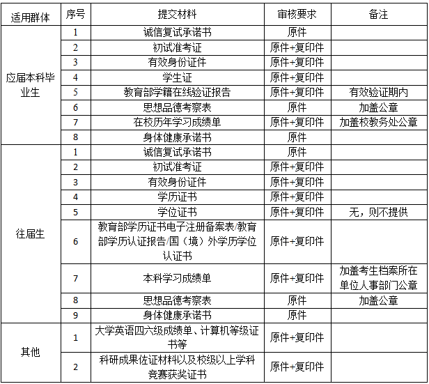 (二)报考资格审查。请考生在复试前按照以下要求携带报名材料供学院进行资格审查,对不符合规定者,不予复试,相关后果由考生本人承担。考生学历(学籍)信息核验有疑问的,应当在复试前完成学历(学籍)核验,并在资格审查时提供相关证明材料。