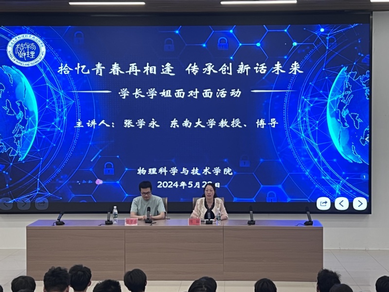 5月29日下午,物科院举办“拾忆青春再相逢 传承创新话未来”学长面对面活动,邀请东南大学青年首席教授、博导,我校2011届应用物理专业校友张学永回母校为物科院师生作题为《为己读书 为国勤奋》主题交流。