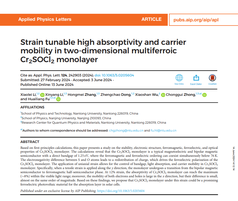 近日,我院仲崇贵教授课题组在应变调控多铁材料光学和输运性能的理论研究方面取得新进展。相关研究成果以《Strain tunable high absorptivity and carrier mobility in two-dimensional multiferroic Cr2SOCl2 monolayer(二维多铁单层Cr2SOCl2中可调的高吸收率与载流子迁移率)》为题发表在自然指数期刊《Applied Physics Letters》(《应用物理快报》)上,仲崇贵教授和傅怀梁教授为共同通讯作者,我院2021级物理学硕士生李晓磊为该论文第一作者,永利3044集团为第一单位。