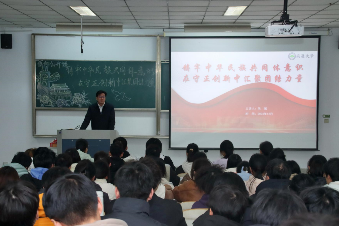 为深入学习贯彻全国民族团结进步表彰大会精神,贯彻落实习近平总书记关于加强和改进民族工作的重要思想,进一步加强学生铸牢中华民族共同体意识教育,推动铸牢中华民族共同体意识宣传教育入脑入心,12月12日下午,校党委常委、统战部部长朱城以《铸牢中华民族共同体意识 在守正创新中汇聚团结力量》为题,为学院物理学(师范)24级本科生讲授《形势与政策》课程。
