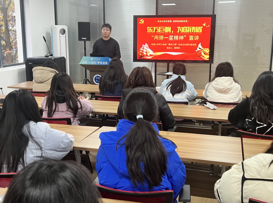 贾秀坤以《东方巨响,为国铸盾》为题,带着同学们一起回顾了中国科技工作者在西北荒漠创造两弹一星伟业的历史,阐述了“两弹一星”精神的内涵,即热爱祖国、无私奉献、自力更生、艰苦奋斗、大力协同、勇于登攀等。宣讲中,他特别强调了“两弹一星”精神的重要性和时代价值,鼓励当代大学生应当传承和发扬这种精神,为实现中华民族伟大复兴而努力奋斗。