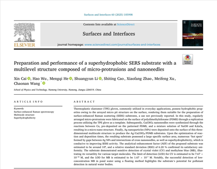 又讯 王超男副教授课题组的另一篇研究论文《Preparation and performance of a superhydrophobic SERS substrate with a multilevel structure composed of micro-protrusions and nanoneedles》于2025年3月1日发表在期刊《Surfaces and Interfaces》上,我院2022级硕士研究生蔡鑫为该论文第一作者,王超男副教授为通讯作者,永利3044集团为第一通讯单位。《Surfaces and Interfaces》是Elsevier出版的一本国际期刊,专注于表面和界面科学的研究。期刊涵盖了与材料表面、薄膜、界面现象、纳米技术等相关的基础和应用研究。现在中科院分区为材料科学:膜二区,影响因子为5.7。