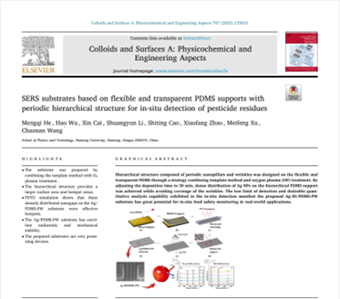 近日,我院王超男副教授课题组在柔性多级周期结构表面增强拉曼散射(SERS)传感技术领域取得新进展。研究论文《SERS substrates based on flexible and transparent PDMS supports with periodic hierarchical structure for in-situ detection of pesticide residues》发表于《Colloids and Surfaces A: Physicochemical and Engineering Aspects》上,永利集团王超男副教授为通讯作者,我院2022级物理学硕士生何梦琪为该论文第一作者,永利3044集团为第一单位。