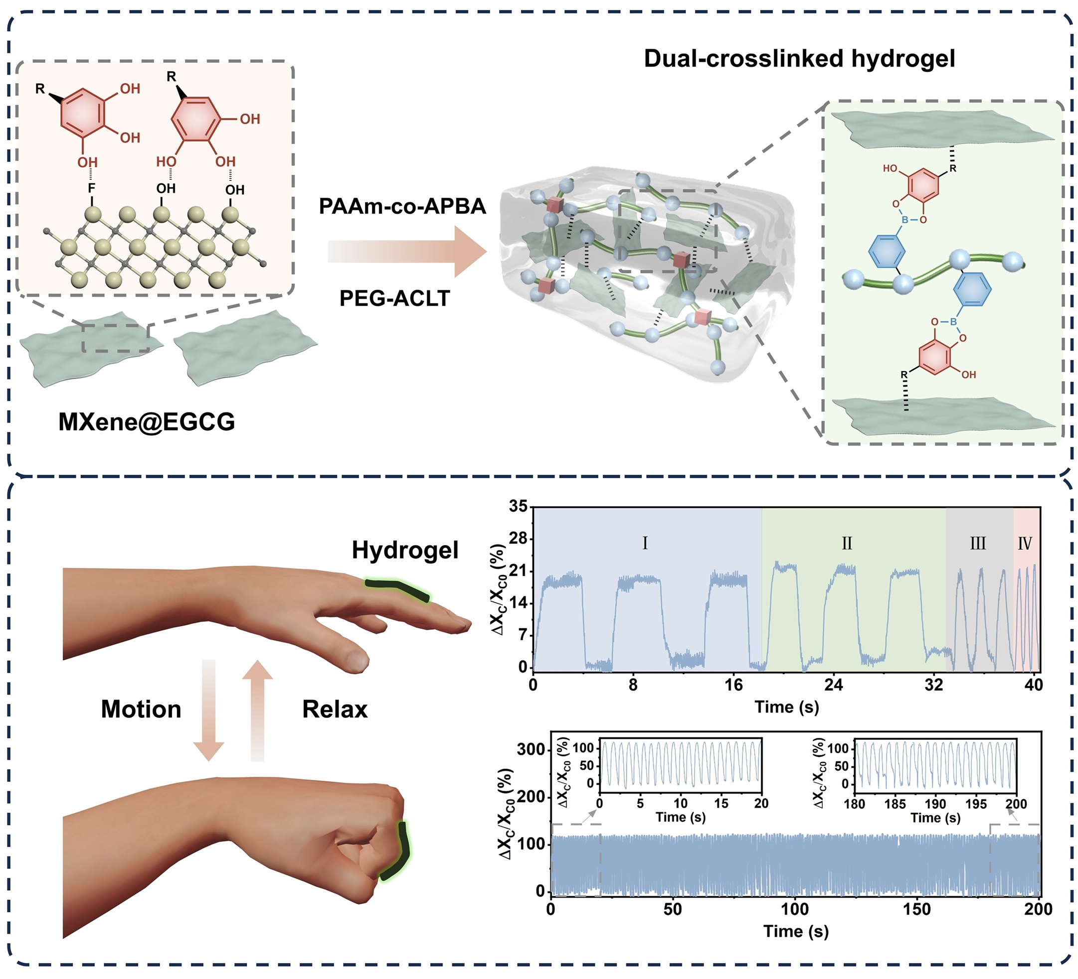柔性传感水凝胶因其优异的力学调控性和生物相容性在可穿戴电子等领域展现广阔前景,基于MXene的水凝胶通过其良好分散性和表面官能团显著提升了传感性能,但其在潮湿高温下易氧化和团聚的问题仍限制了实际应用中的稳定性与可靠性。本研究针对MXene水凝胶在柔性传感应用中存在的氧化、聚集等稳定性问题,提出了基于天然抗氧化剂EGCG构建双交联网络的新策略。通过EGCG与3-丙烯酰胺基苯基硼酸之间的氢键与动态共价键协同作用,构建了力学性能优异、MXene稳定性显著提升的PBA/ME水凝胶体系。该水凝胶展现出高机械强度(压缩断裂强度超5 MPa)、低滞后高灵敏的传感性能(压缩与拉伸GF分别超过10和3.5),并在多种人体运动状态下实现快速响应;同时具备良好的生物相容性与粘附性能,可广泛粘附于多种基底表面。研究为MXene水凝胶的稳定固定与高性能集成提供了有效方案,展示了其在柔性电子、生物传感及软体机器人等领域的应用潜力。