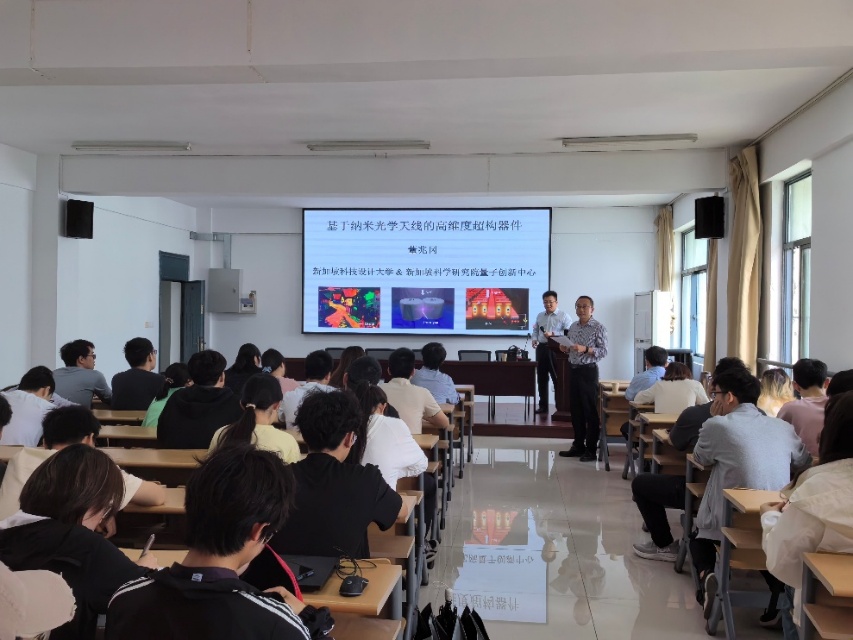 514日,新加坡科技设计大学董兆冈副教授应邀来院作题为《基于纳米光学天线的高维度超构器件》的学术报告。我院60余位师生代表参加报告会,院长仲崇贵教授主持报告会。