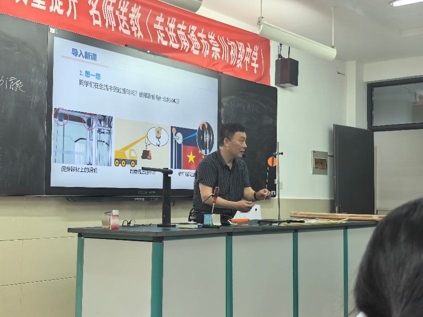 崇川初级中学物理组六位经验丰富的骨干教师采用“杠杆”与“滑轮”同课异构的形式开展示范教学。在“杠杆”教学中,教师以“拔图钉”实验导入课堂,通过个性化任务引导学生探究支点位置与施力关系,逐步构建杠杆概念;在“滑轮”教学中,则借助滑轮组模型设计情境,让学生在操作中分析定滑轮与动滑轮的机械特性。六位教师均以“问题链”串联课堂,结合分组实验探究、数据记录与讨论总结,帮助学生从现象观察走向规律提炼,充分体现“做中学”的教学理念。