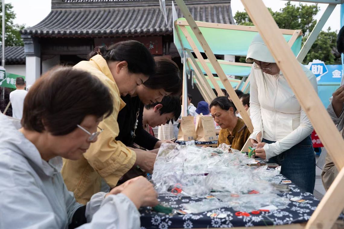 活动现场,室内“幸福邻里微空间”正式发布、“顺手公益”项目同步启动,室外邻里市集热闹非凡。物科院本科生党支部书记、爱倍加志愿服务团指导老师陈祎妮带领支部师生党员精心策划的“党建+非遗”防蚊香囊手作体验活动,成为市集焦点,摊位前人头攒动,社区居民络绎不绝,充分肯定了学院在推动社区文化建设中的积极作用。蓝色渐变背景的展位与醒目的“文化传承”“匠心手作”标语交相辉映,党员们早早准备好艾草、香料、布料、针线等香囊制作材料,并细心分装成套,整齐摆放,等待居民前来体验。在手作环节,大家围绕图案拼缝、针脚控制、草药填充、封口装饰等流程,带领居民们一步步亲手完成香囊制作。面对不少首次尝试传统刺绣的居民,党员们耐心教学,让零基础的参与者也能快速掌握制作要领。