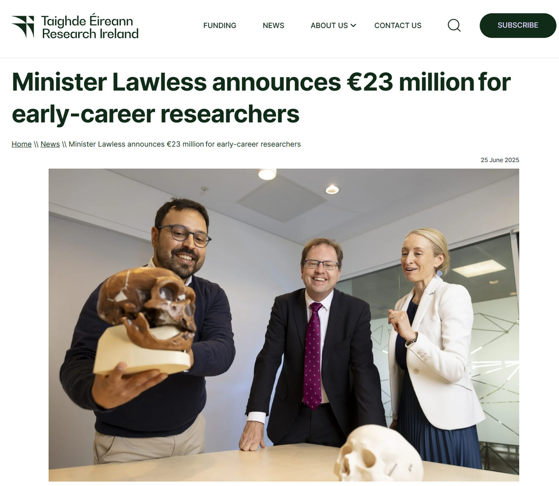 近日,我院黎菁博士获得由爱尔兰国家科学基金会(SFI)和爱尔兰研究委员会(IRC)联合资助的Research Ireland Pathway研究项目。此项目将支持研究人员并提供资源以建立独立的研究事业。这项有针对性的投资将为每个项目提供额外的支持,以培养博士研究生,共计资助230万欧元。2025年,该项目一共资助了36个研究项目,涵盖了科学、技术、工程和数学(STEM)以及艺术、人文和社会科学等领域。
