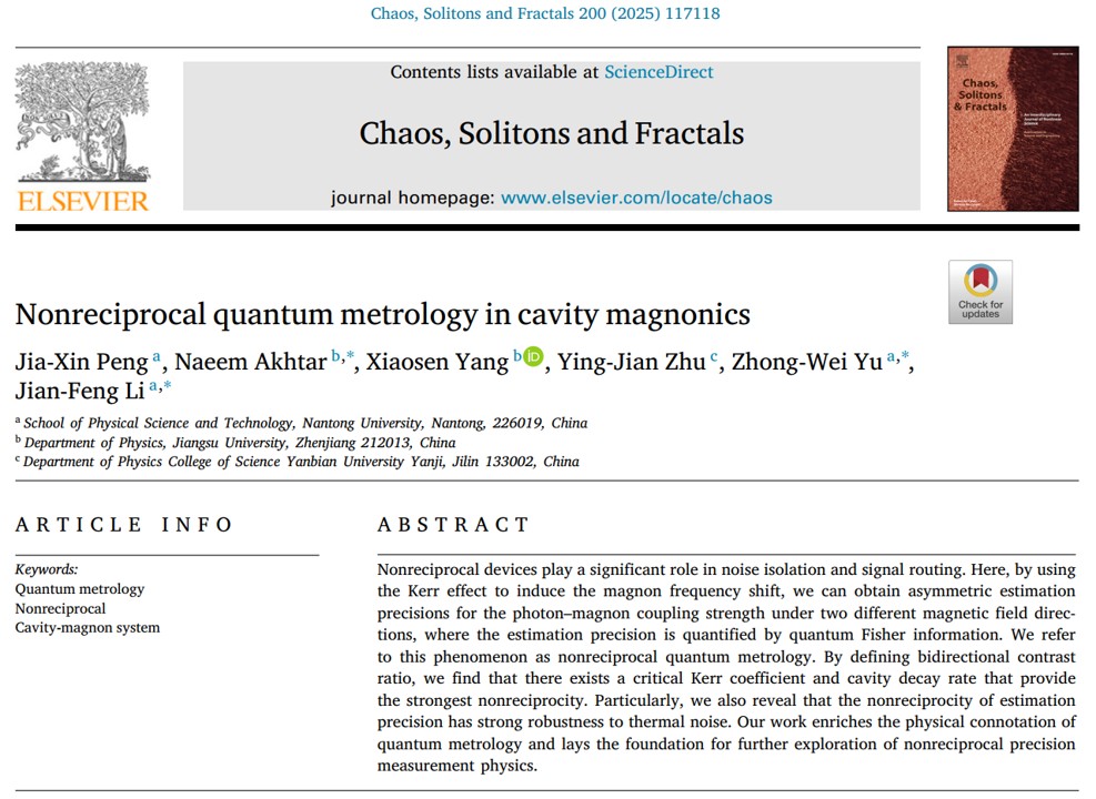 近日,我院彭家鑫博士团队与江苏大学学者合作,在非互易量子精密测量研究方面取得新进展。相关研究成果以“Nonreciprocal quantum metrology in cavity magnonics”为题发表在中科院一区Top期刊《Chaos, Solitons and Fractals》上。永利3044集团为第一单位。