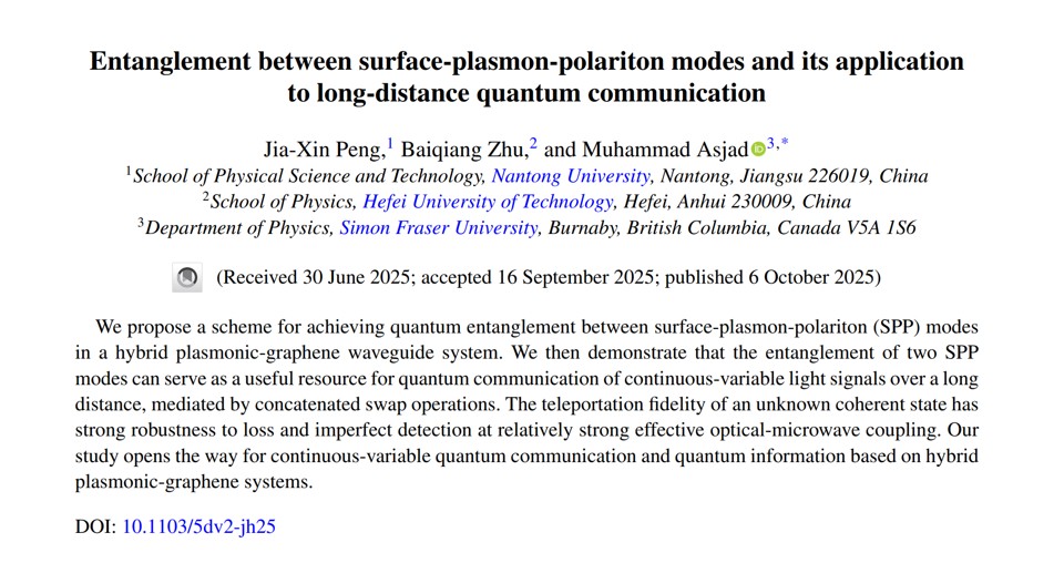 近日,我院彭家鑫博士与合肥工业大学朱百强博士后、加拿大西蒙弗雷泽大学(Simon Fraser University)Muhammad Asjad副教授合作,在量子纠缠与量子通信研究方面取得新进展。相关研究成果以“Entanglement between surface-plasmon-polariton modes and its application to long-distance quantum communication”为题发表在自然指数期刊《Physical Review A》上。永利3044集团为第一单位。