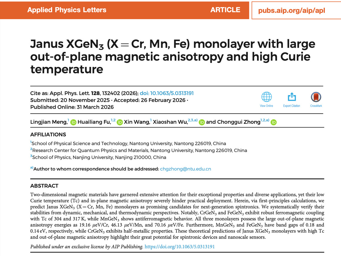 近期,我院仲崇贵教授课题组在二维铁磁材料的相变及磁各向异性的研究方面取得新进展。相关成果以《Janus XGeN3 (X = Cr, Mn, Fe) monolayer with large out-of-plane magnetic anisotropy and high Curie temperature》(JanusXGeN3(X = Cr, Mn, Fe)单层中的大垂直磁各向异性及高居里温度)为题发表在NatureIndex期刊《Applied Physics Letters》上,仲崇贵教授和南京大学吴小山教授为共同通讯作者,我院2023级硕士研究生孟令剑为第一作者,永利3044集团为第一通讯单位。